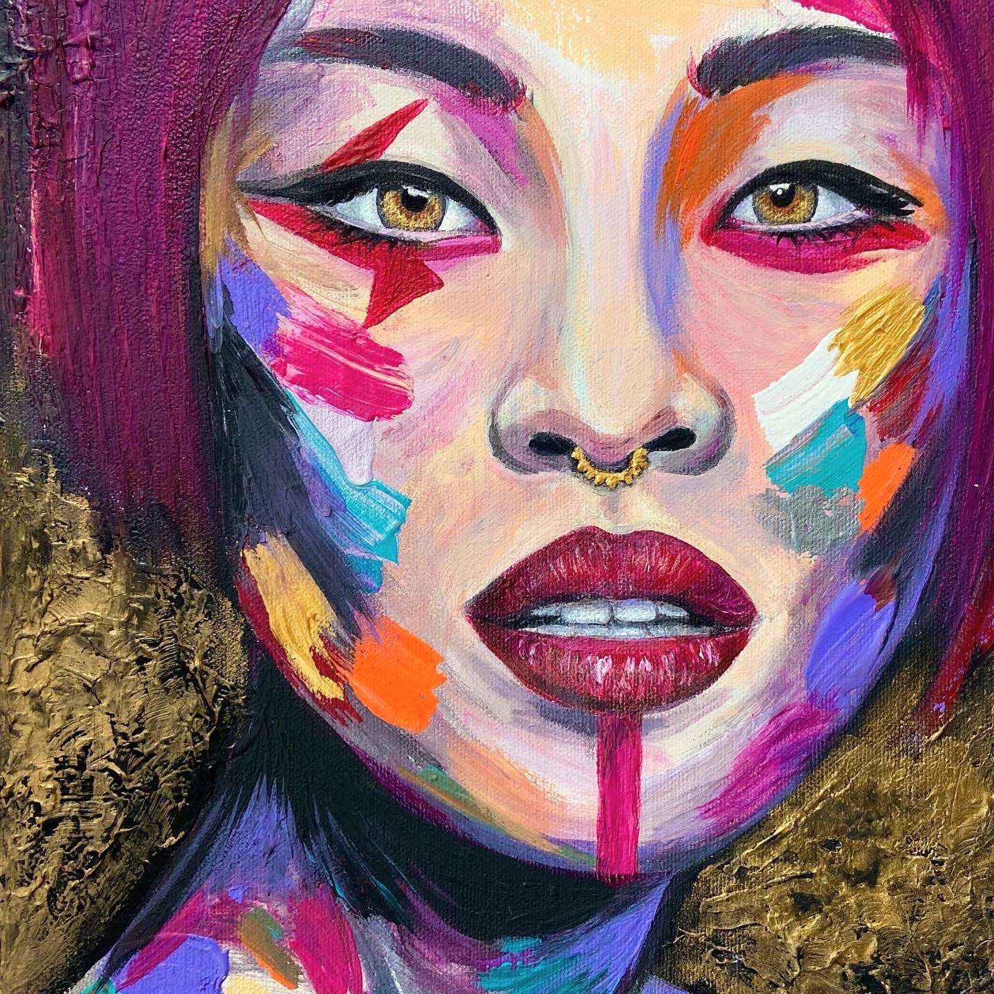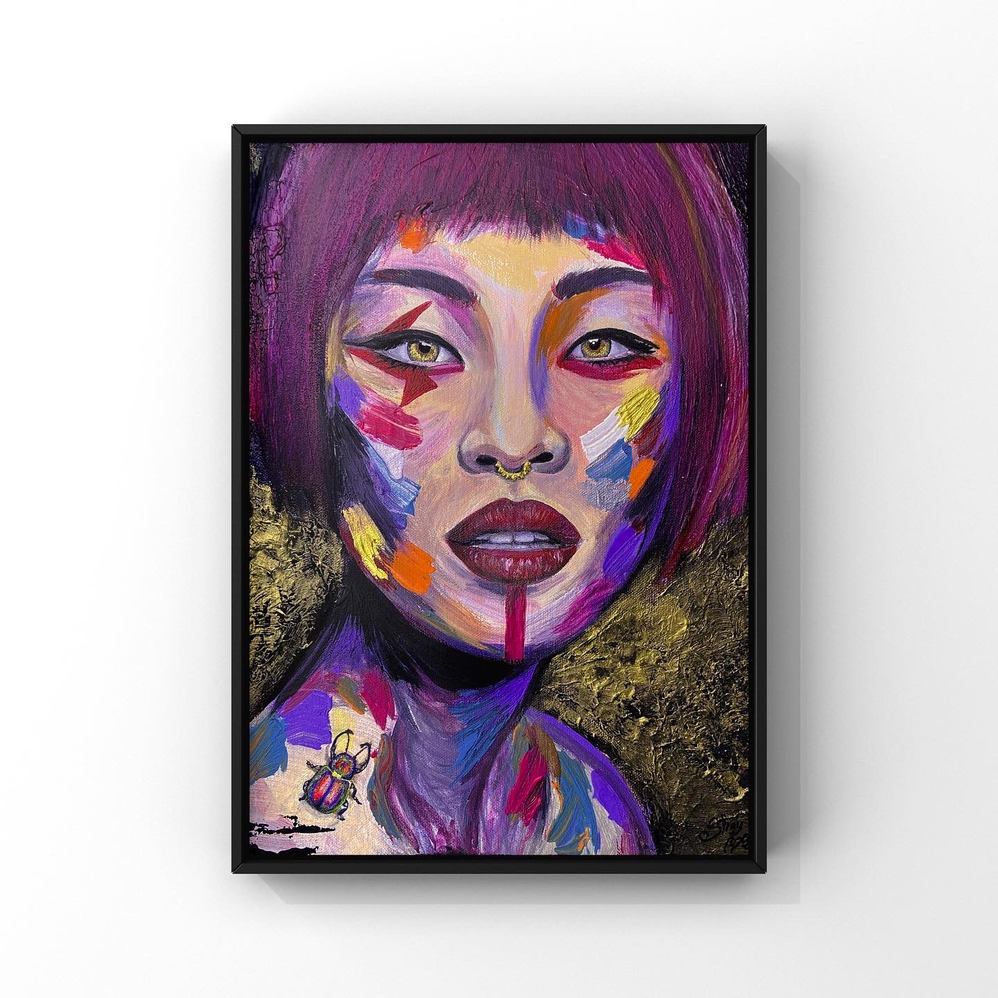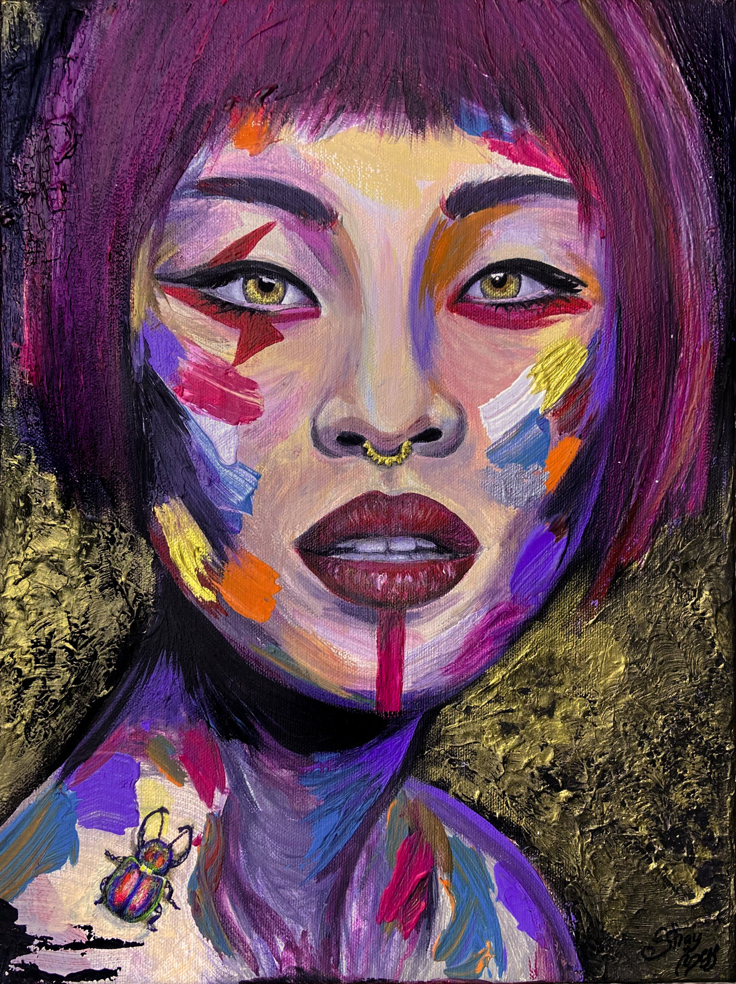 The use of flat colors on her face gives the impression of a mask or a stylized representation, while still maintaining a sense of beauty and mystery. The focal point of the painting is a beetle perched on Sakura's arm, symbolizing resurrection and new beginnings. The beetle's iridescent shell shines with an array of colors, complementing the golden tones in Sakura's eyes. Overall, the painting exudes a sense of power and transformation, inviting the viewer to contemplate the potential for growth and renewal in their own lives.