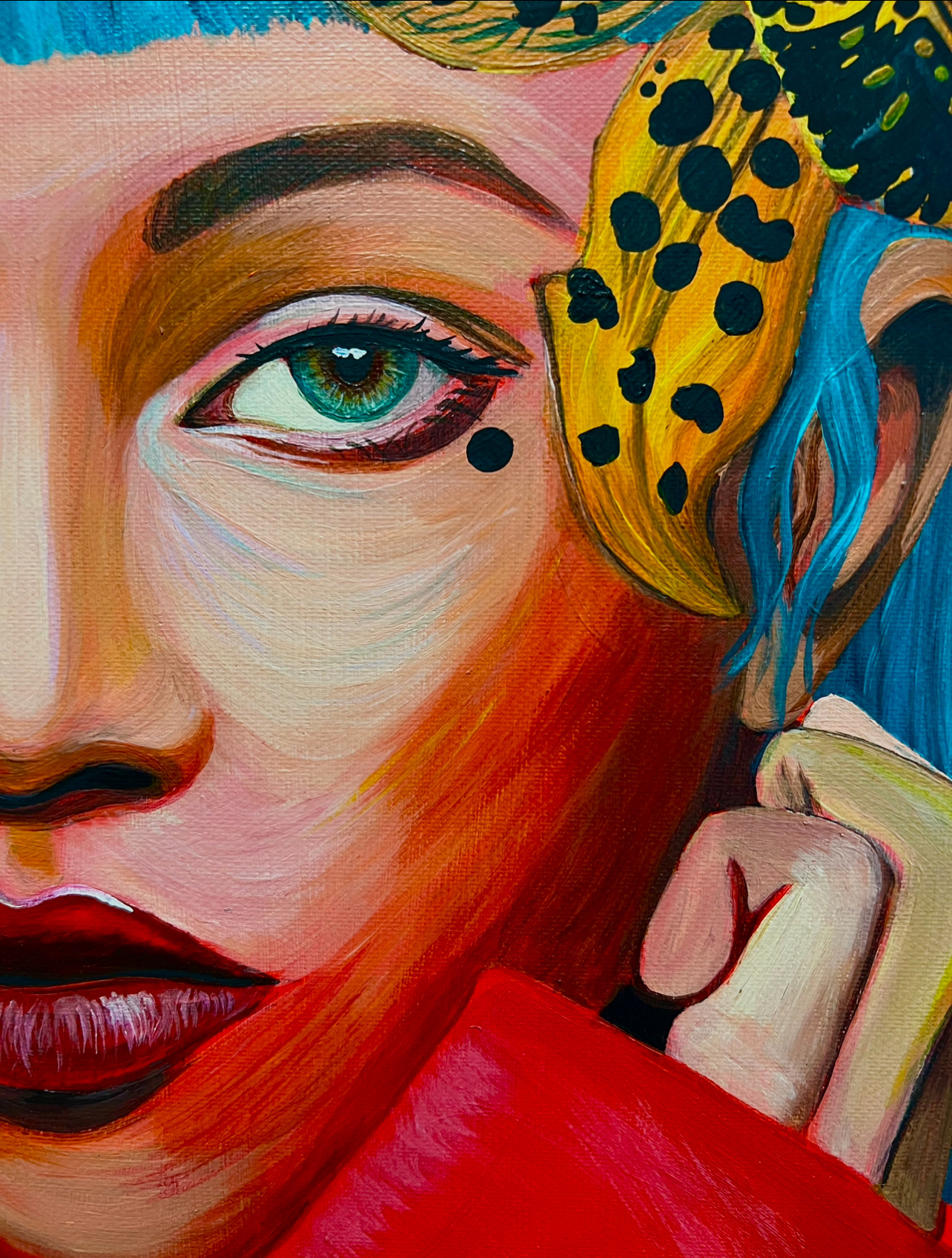 Her blue hair flows against the deep red, brushstrokes dance across her face, shaping her features with movement, as if she were coming to life with each layer of paint.